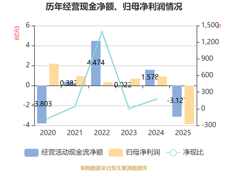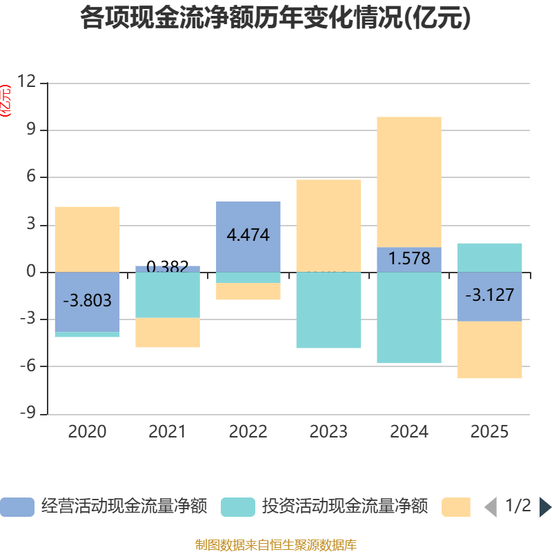 截至2025年,公司经营活动现金流净额为-3.13亿元,同比减少4.71亿元;筹资活动现金流净额-3.61亿元,同比减少11.87亿元;投资活动现金流净额1.81亿元,上年同期为-5.77亿元。