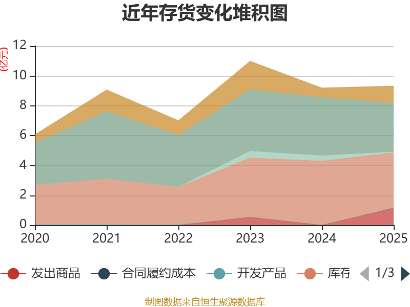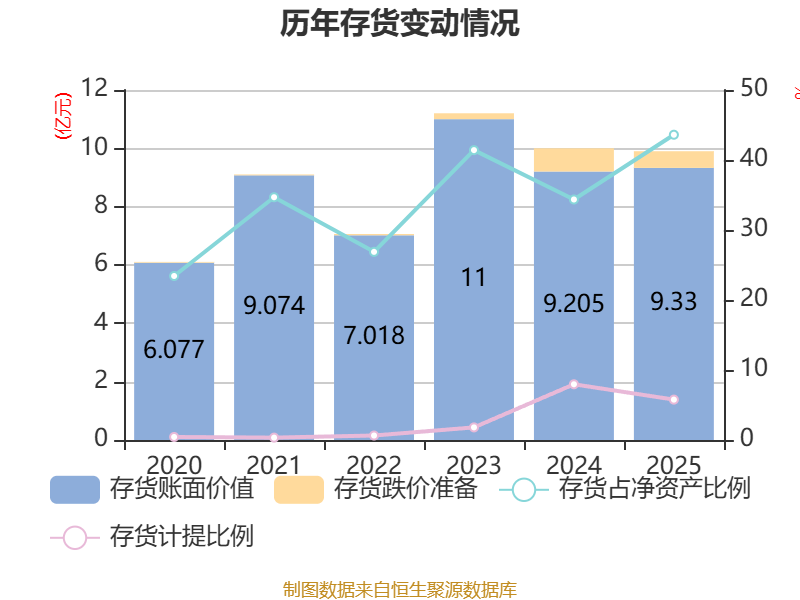 从存货变动来看,截至2025年末,公司存货账面价值为9.33亿元,占净资产的43.61%,较上年末增加1252.74万元。其中,存货跌价准备为5708.13万元,计提比例为5.77%。
