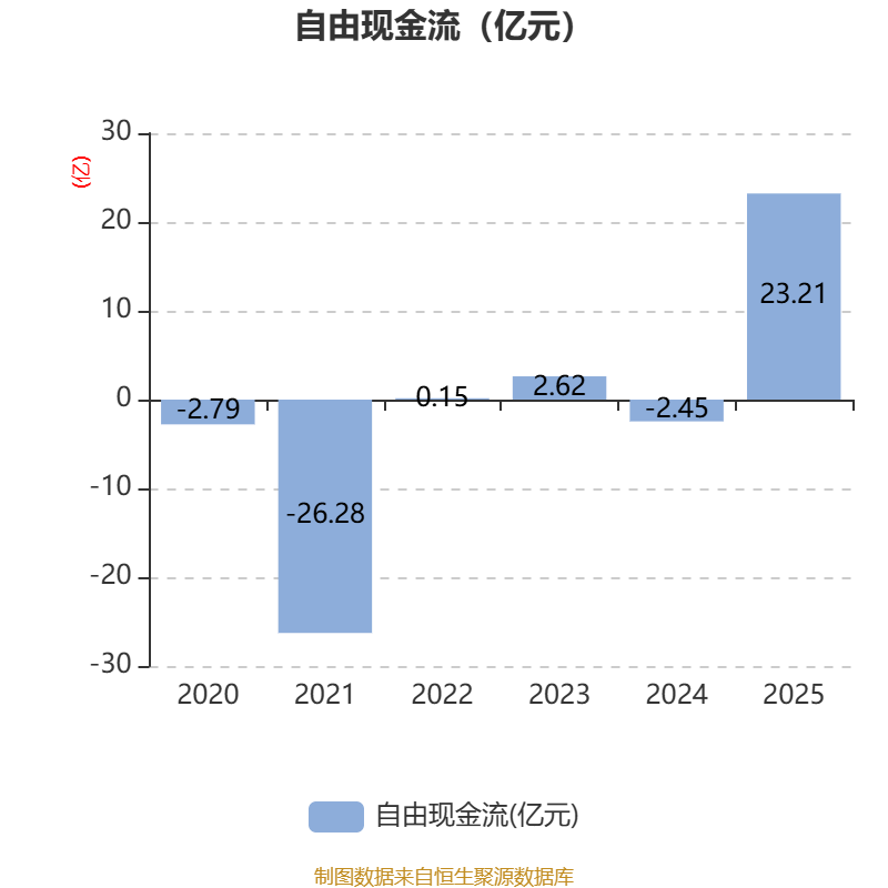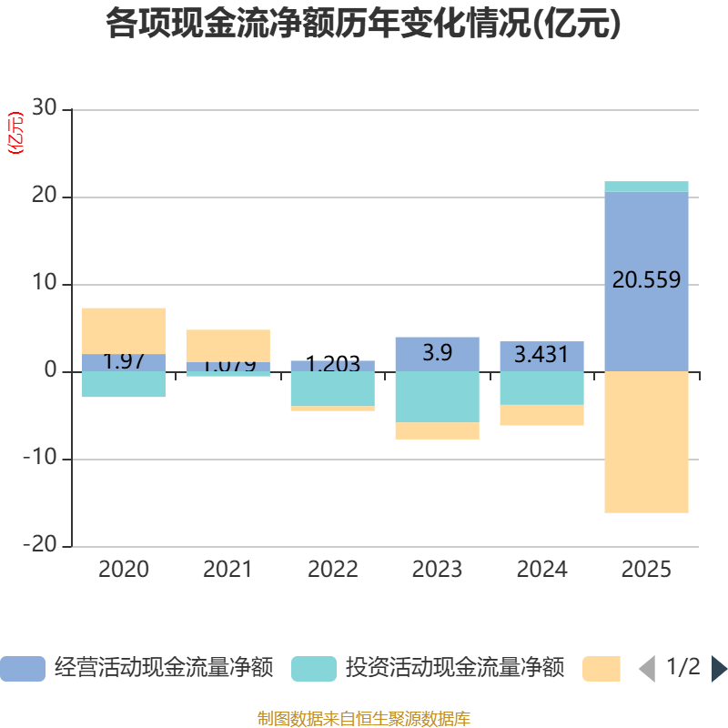 截至2025年,公司经营活动现金流净额为20.56亿元,同比增长499.18%;筹资活动现金流净额-16.22亿元,同比减少13.87亿元;投资活动现金流净额1.2亿元,上年同期为-3.84亿元。