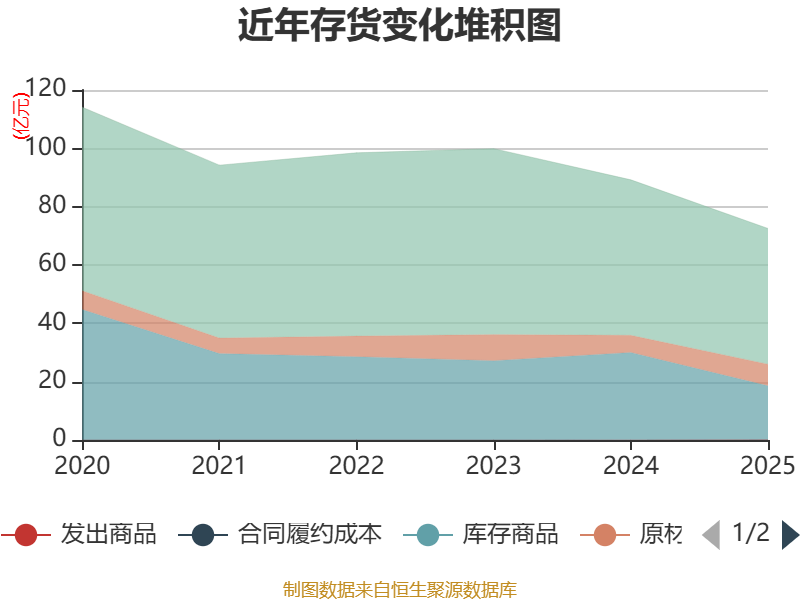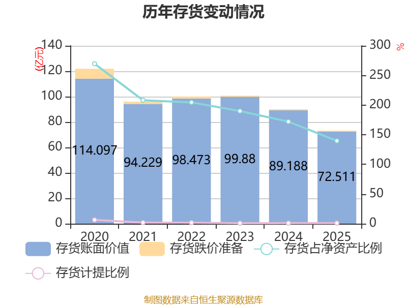 从存货变动来看,截至2025年末,公司存货账面价值为72.51亿元,占净资产的139.67%,较上年末减少16.68亿元。其中,存货跌价准备为7068.18万元,计提比例为0.97%。