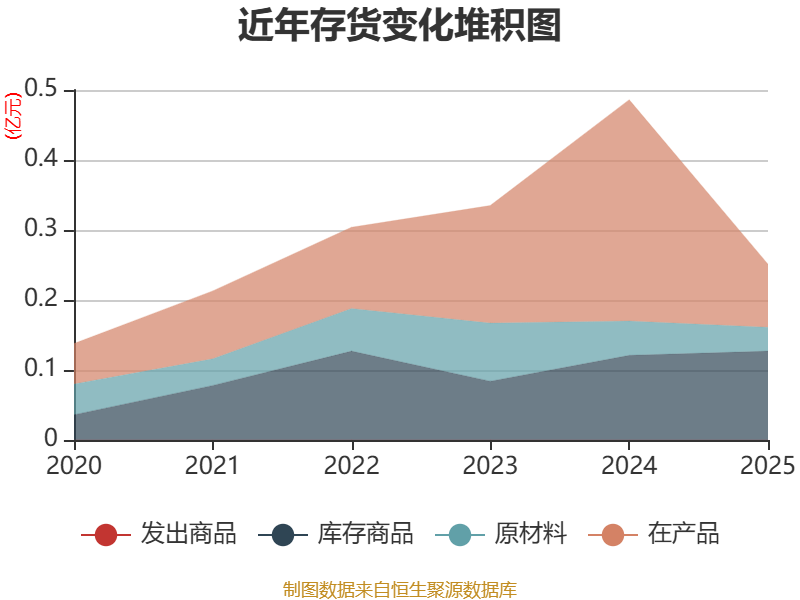 从存货变动来看,截至2025年末,公司存货账面价值为2504.09万元,占净资产的3.55%,较上年末减少2357万元。其中,存货跌价准备为995.36万元,计提比例为28.44%。