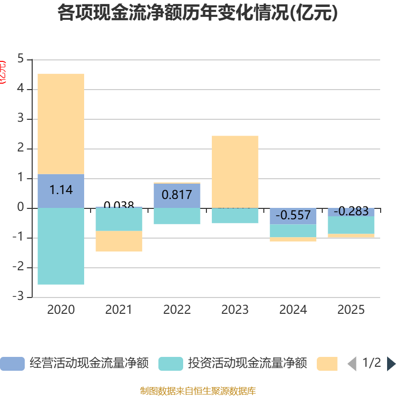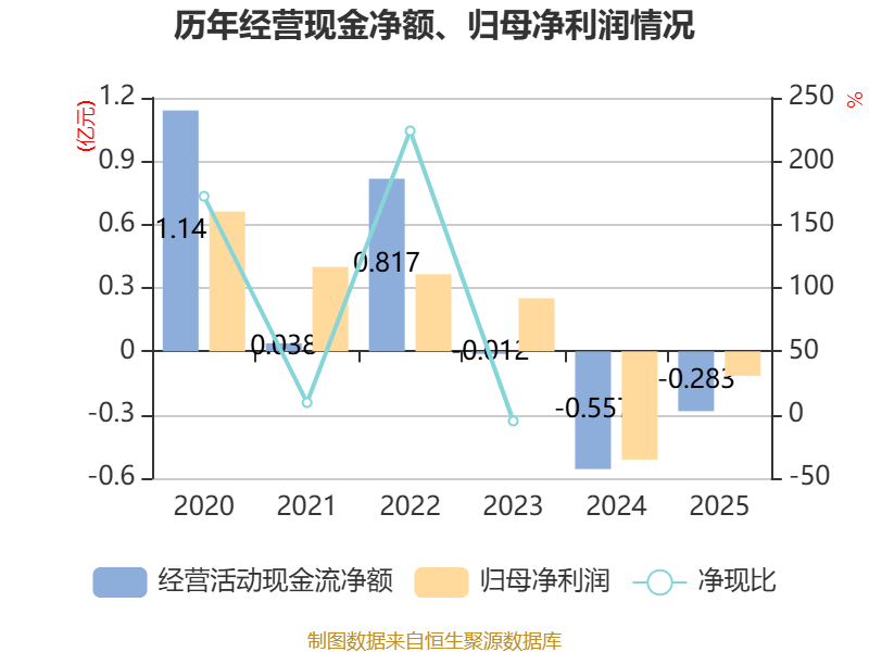 截至2025年,公司经营活动现金流净额为-2826.16万元,同比增加2743.07万元;筹资活动现金流净额-1147.27万元,同比增加257.66万元;投资活动现金流净额-5926.74万元,上年同期为-4334.39万元。