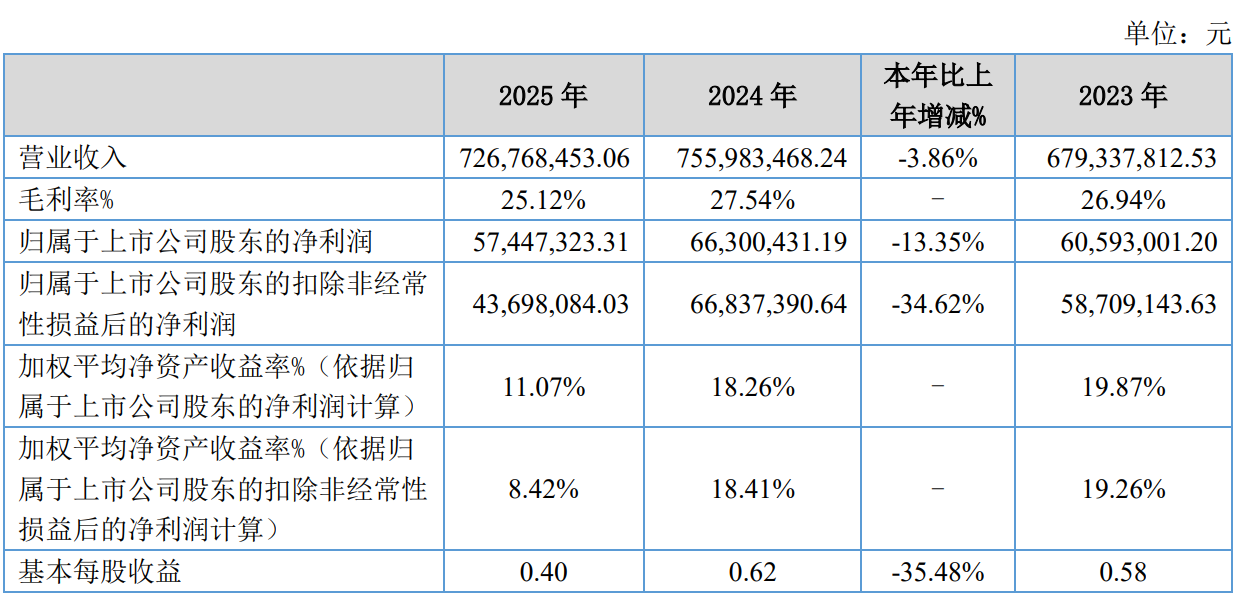 中证智能财讯方正阀门(920082)4月20日披露2025年年度报告。2025年,公司实现营业总收入7.27亿元,同比下降3.86%;归母净利润5744.73万元,同比下降13.35%;扣非净利润4369.81万元,同比下降34.62%;经营活动产生的现金流量净额为4854.01万元,同比增长177.97%;报告期内,方正阀门基本每股收益为0.4元,加权平均净资产收益率为11.07%。公司2025年度分配预案为:拟向全体股东每10股转4股,派现1.3元(含税)。