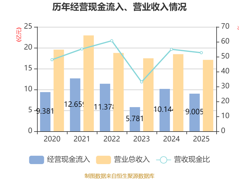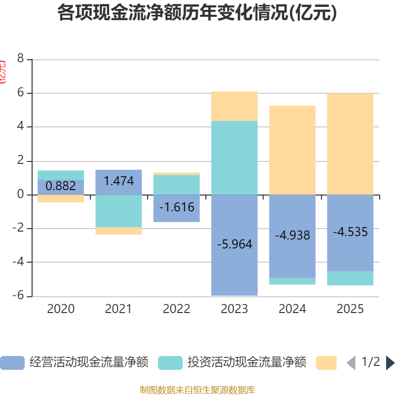 截至2025年,公司经营活动现金流净额为-4.54亿元,同比增加4031.63万元;筹资活动现金流净额5.97亿元,同比增加7178.66万元;投资活动现金流净额-8191.96万元,上年同期为-3736.57万元。
