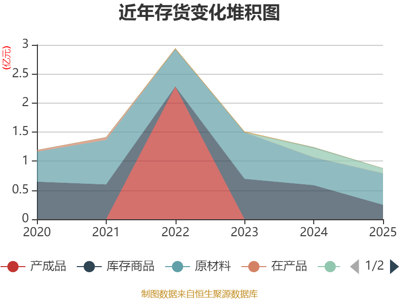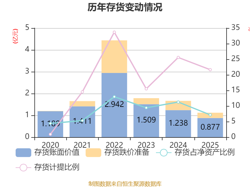 从存货变动来看,截至2025年末,公司存货账面价值为8772.81万元,占净资产的7.15%,较上年末减少3608.45万元。其中,存货跌价准备为2423.22万元,计提比例为21.64%。