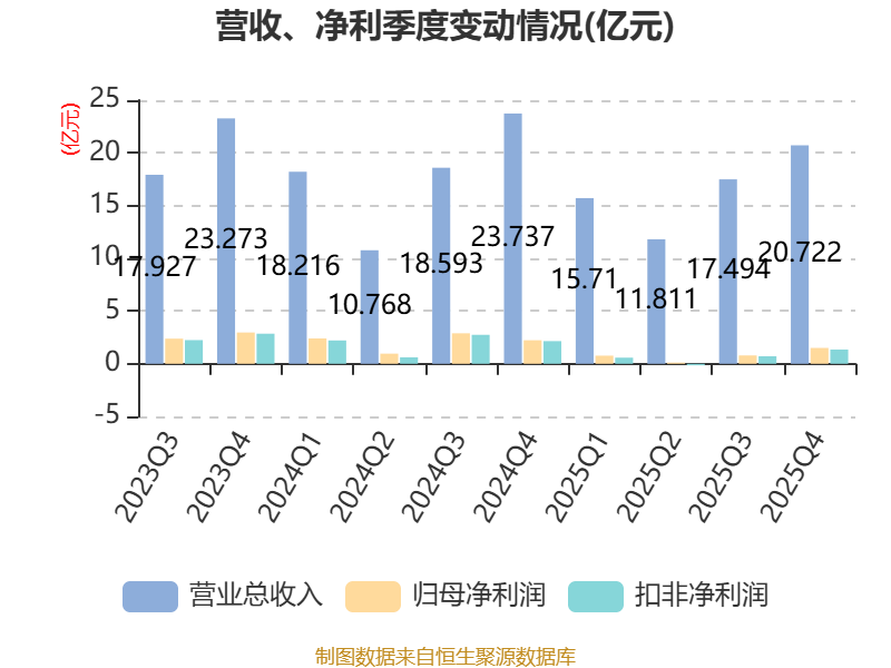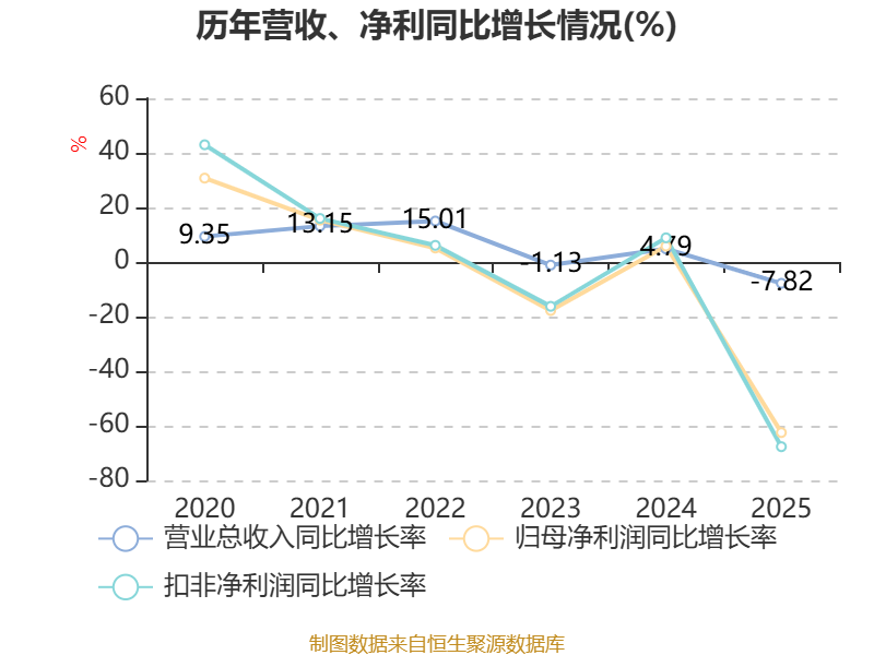 中证智能财讯洽洽食品(002557)4月21日披露2025年年度报告。2025年,公司实现营业总收入65.74亿元,同比下降7.82%;归母净利润3.18亿元,同比下降62.51%;扣非净利润2.5亿元,同比下降67.68%;经营活动产生的现金流量净额为7044.73万元,同比下降93.22%;报告期内,洽洽食品基本每股收益为0.628元,加权平均净资产收益率为5.71%。公司2025年度分配预案为:拟向全体股东每10股派现10元(含税)。