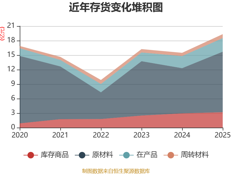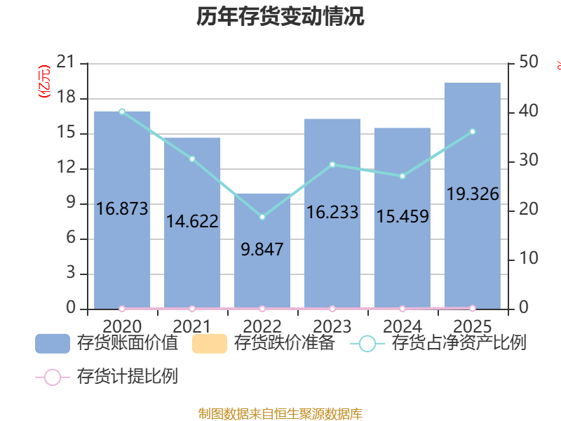 从存货变动来看,截至2025年末,公司存货账面价值为19.33亿元,占净资产的36.07%,较上年末增加3.87亿元。其中,存货跌价准备为182.21万元,计提比例为0.09%。