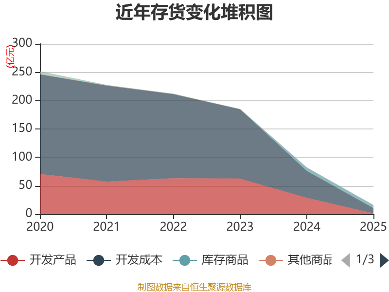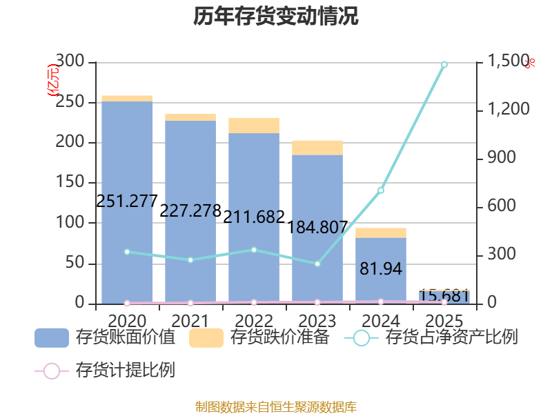 从存货变动来看,截至2025年末,公司存货账面价值为15.68亿元,占净资产的1484.62%,较上年末减少66.26亿元。其中,存货跌价准备为1.65亿元,计提比例为9.52%。
