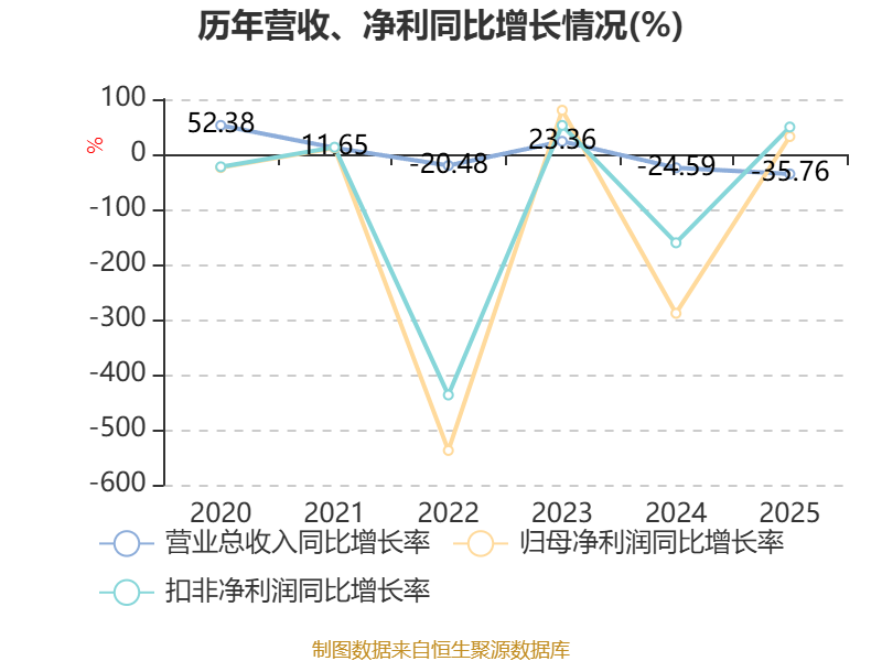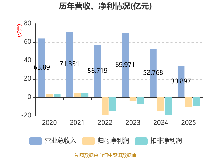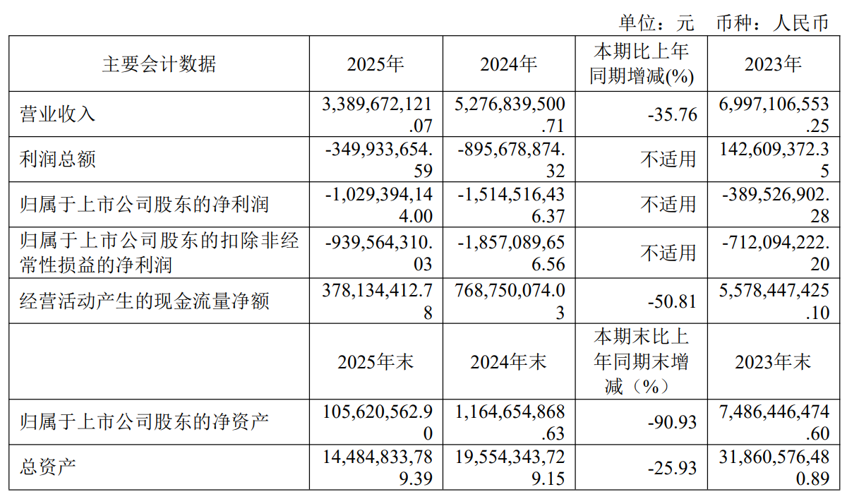 中证智能财讯珠免集团(600185)4月21日披露2025年年度报告。2025年,公司实现营业总收入33.9亿元,同比下降35.76%;归母净利润亏损10.29亿元,上年同期亏损15.15亿元;扣非净利润亏损9.4亿元,上年同期亏损18.57亿元;经营活动产生的现金流量净额为3.78亿元,同比下降50.81%;报告期内,珠免集团基本每股收益为-0.55元,加权平均净资产收益率为-158.38%。