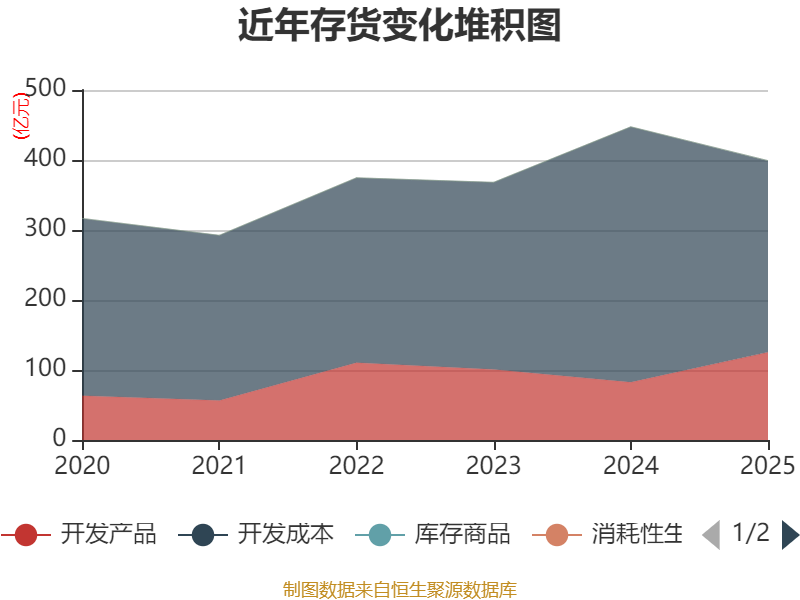 从存货变动来看,截至2025年末,公司存货账面价值为399.12亿元,占净资产的1463.16%,较上年末减少48.29亿元。其中,存货跌价准备为13.89亿元,计提比例为3.36%。