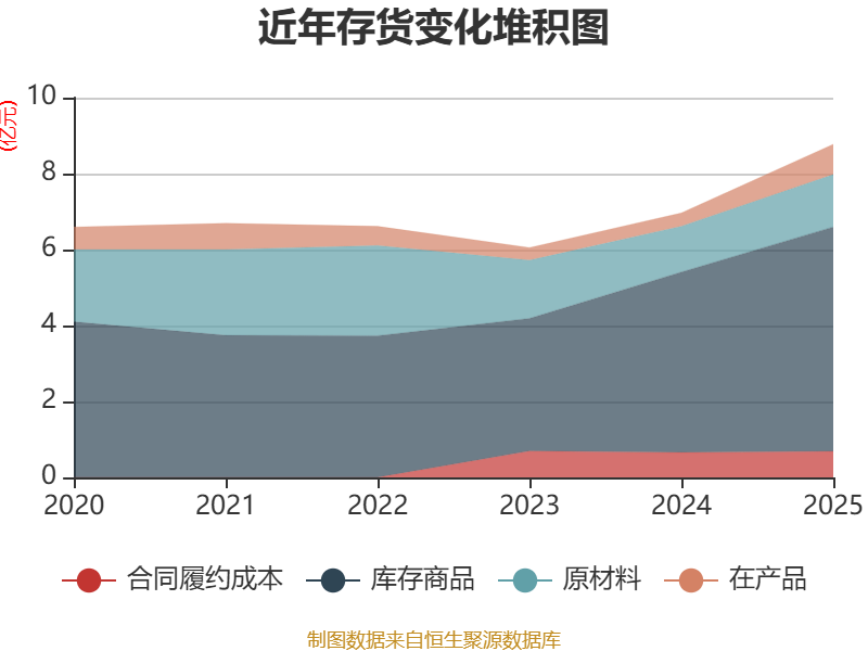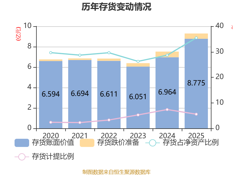 从存货变动来看,截至2025年末,公司存货账面价值为8.78亿元,占净资产的35.44%,较上年末增加1.81亿元。其中,存货跌价准备为5146.27万元,计提比例为5.54%。