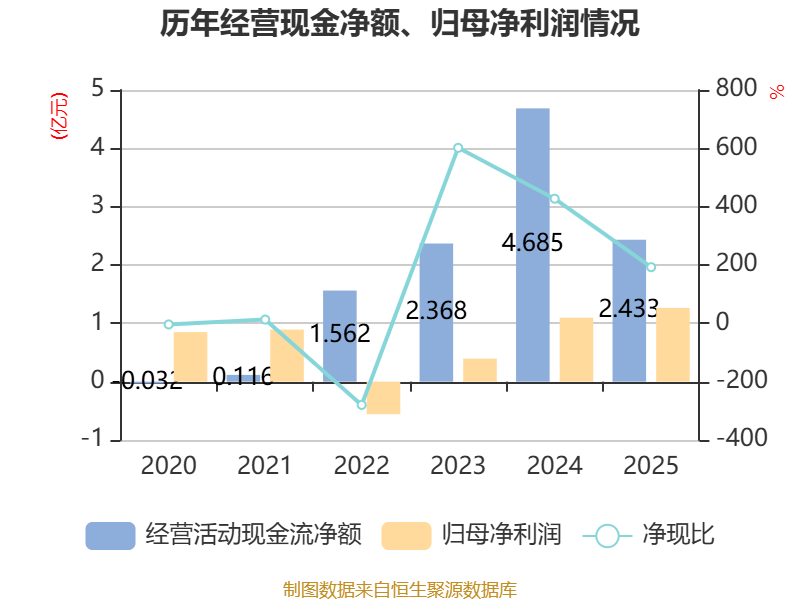 截至2025年,公司经营活动现金流净额为2.43亿元,同比下降48.06%;筹资活动现金流净额-7460.19万元,同比增加6919.48万元;投资活动现金流净额-5257.61万元,上年同期为-1.22亿元。