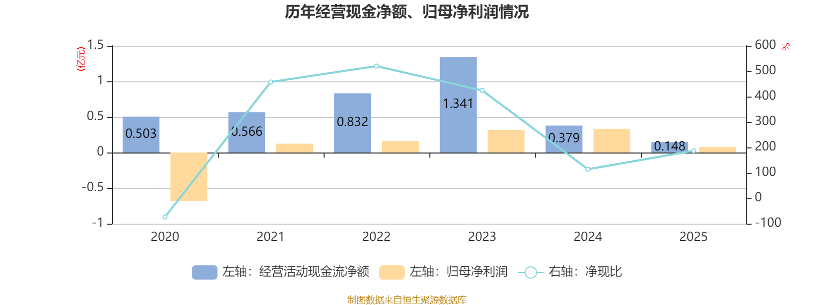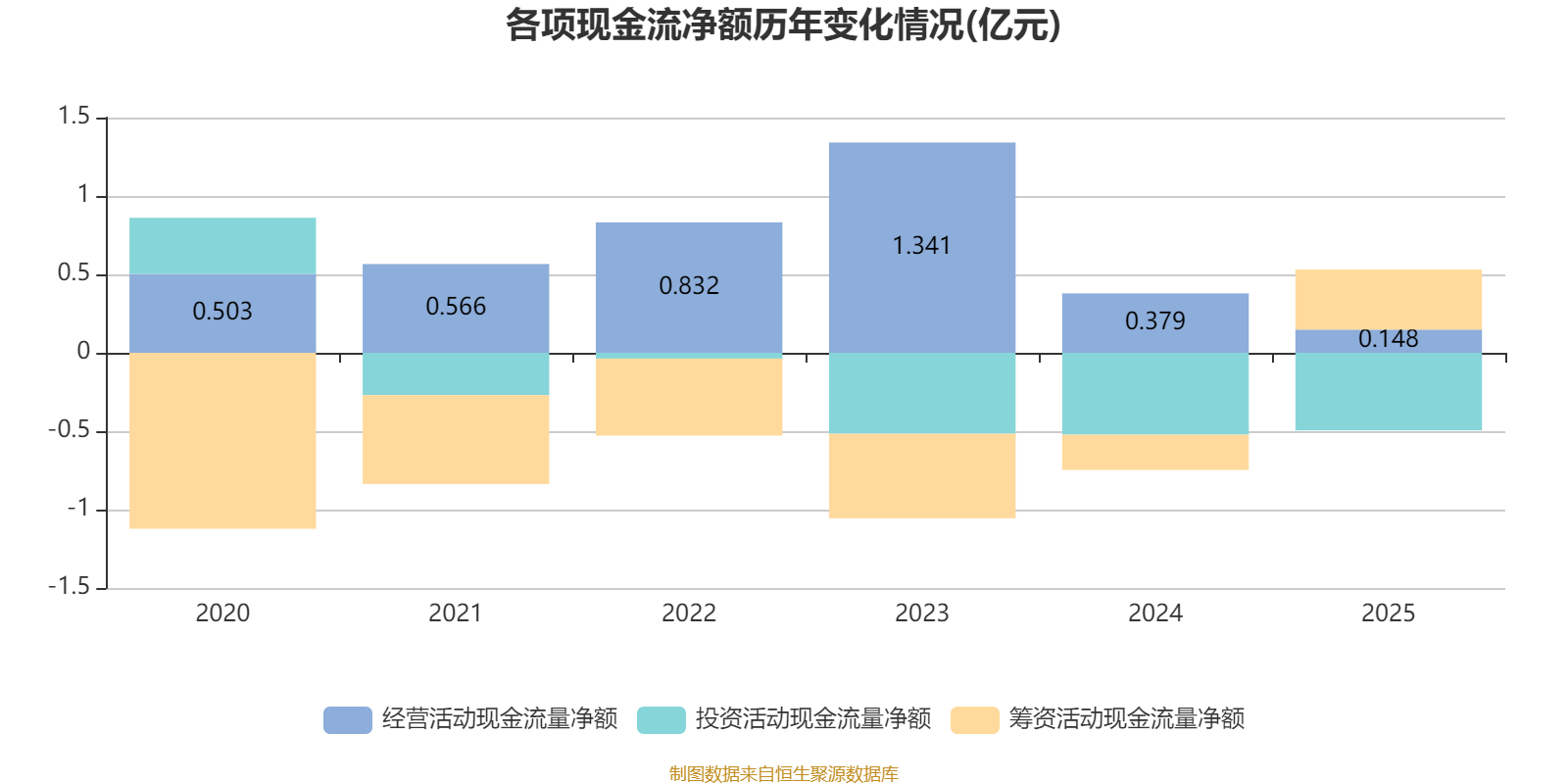 2025年,公司经营活动现金流净额为1475.3万元,同比下降61.06%;筹资活动现金流净额3832.39万元,同比增加6077.39万元;投资活动现金流净额-4946.86万元,上年同期为-5219.94万元。