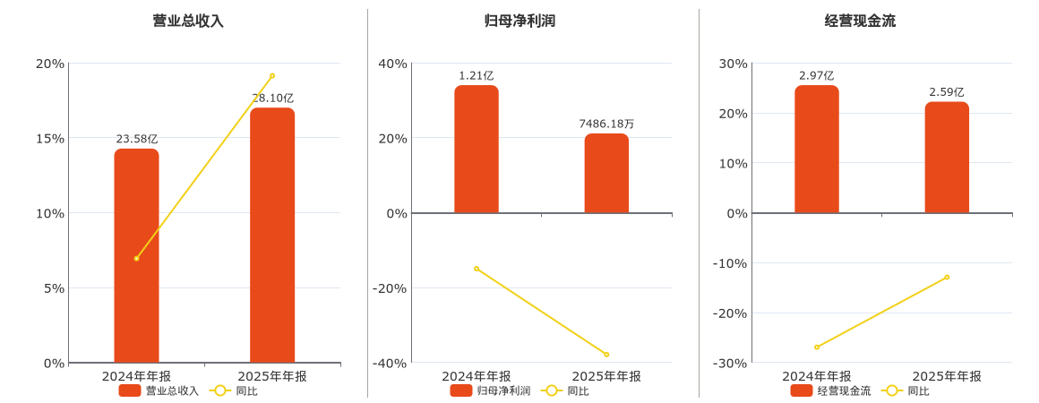 公司营业总收入为28.10亿元。归母净利润为7486.18万元,较去年同报告期归母净利润减少4571.73万元,同比较去年同期下降37.91%。经营活动现金净流入为2.59亿元,较去年同报告期经营活动现金净流入减少3848.84万元,同比较去年同期下降12.95%。