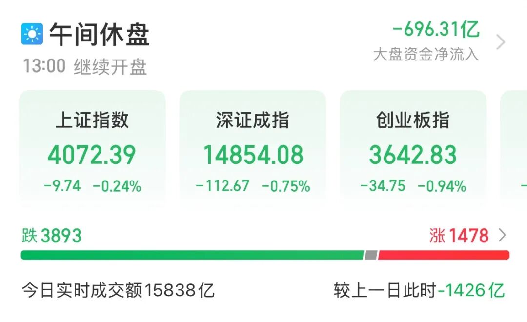4月21日早盘,A股震荡调整,科技股全线回调,深证成指、创业板指盘中一度跌超1%。截至午间收盘,上证指数报4072.39点,跌0.24%;深证成指跌0.75%,创业板指跌0.94%,科创综指跌1.69%。沪深北三市半日成交15838亿元,宁德时代半日成交145.27亿元,位居A股第一。