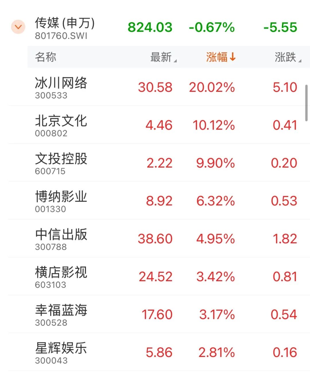 早盘,传媒板块有所表现,游戏、影视方向涨幅居前。截至午间收盘,冰川网络以20%幅度涨停,股价报30.58元/股。