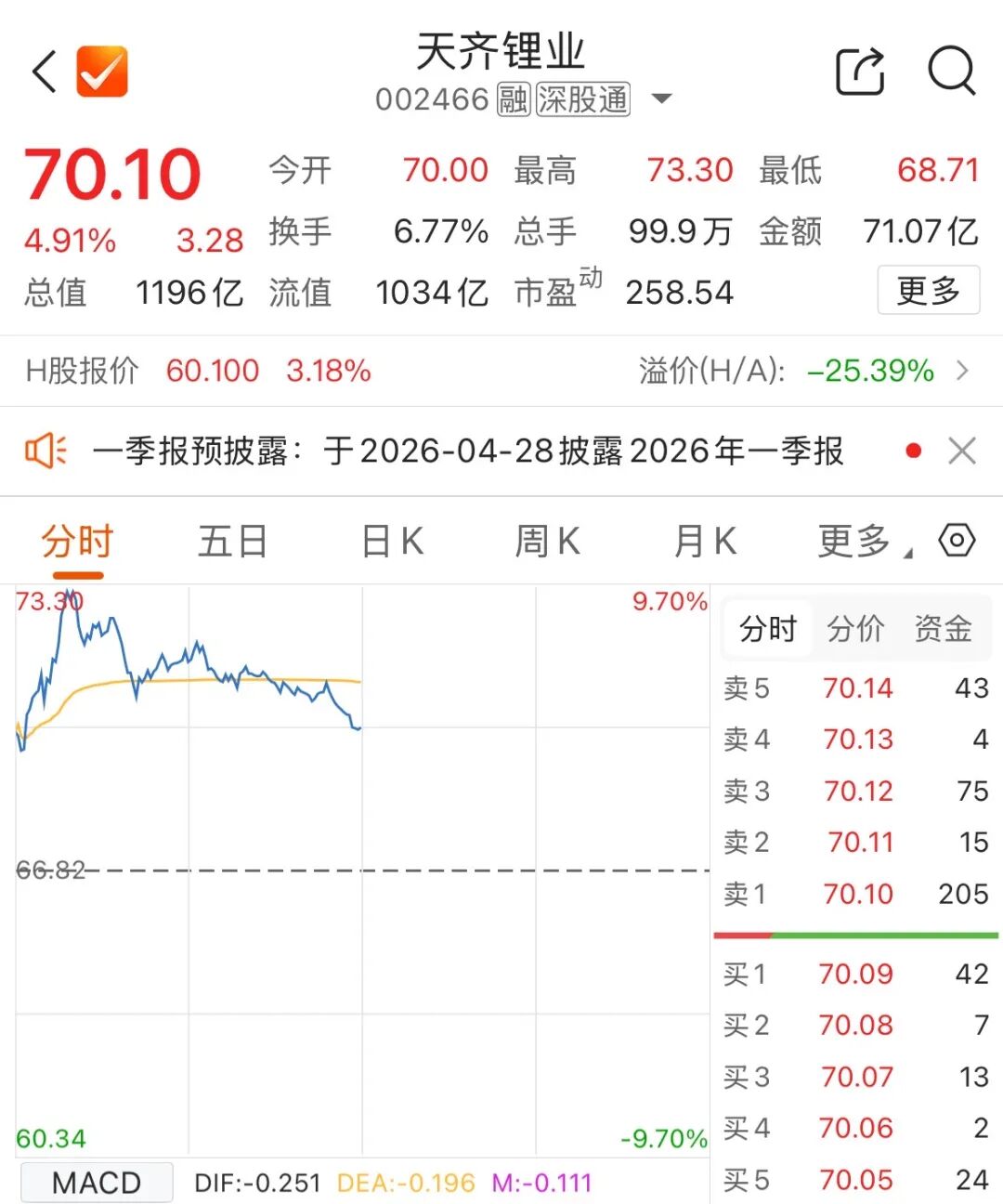 早盘,锂矿概念逆势活跃,天齐锂业盘中一度接近涨停,股价最高涨至73.30元/股。截至午间收盘,天齐锂业涨4.91%,总市值1196亿元,成交额71.07亿元。