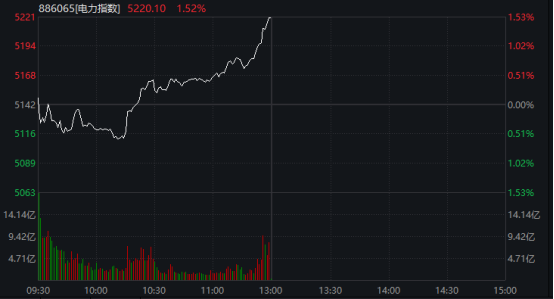今日盘中,电力板块大幅走高,Wind电力指数由跌转涨,截至午间收盘涨1.52%。
