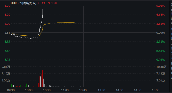 电力板块盘中大幅走高,多只个股盘中直线拉升,粤电力A(000539)、广安爱众(600979)等均在10分钟内拉升涨停。