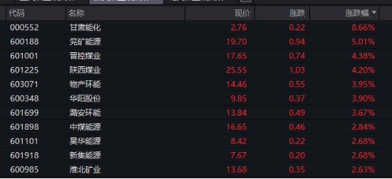 主要行业板块和赛道方面,若按照申万一级行业划分,煤炭板块领涨,板块涨幅超过2%,甘肃能化、兖矿能源、晋控煤业、陕西煤业等涨幅居前。