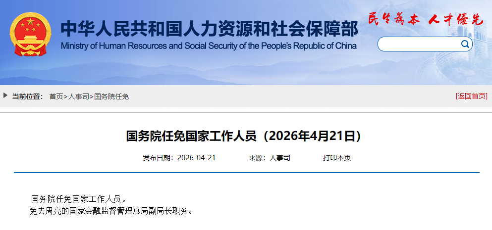 据人社部网站4月21日消息,国务院任免国家工作人员。免去周亮的国家金融监督管理总局副局长职务。