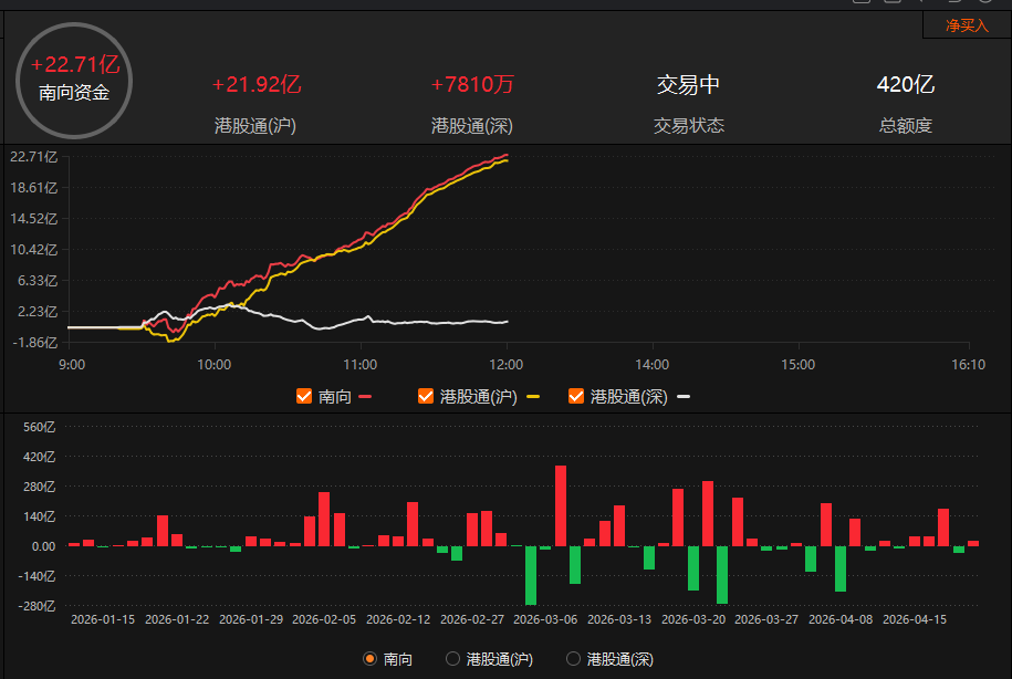 南向资金方面,早盘南向资金净流入22.71亿港元。