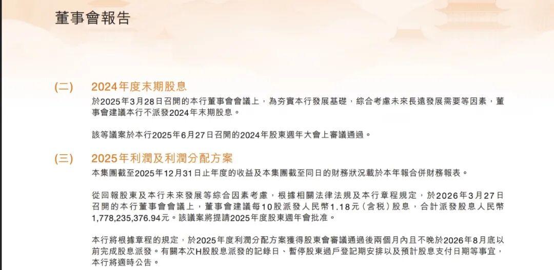 2025年半年报中显示,董事会建议该行不派发2024年与2025年中期股息。其中,该行明确了不派发2024年度股息的原因是“为夯实本行发展基础,综合考虑未来长远发展需要等因素”。