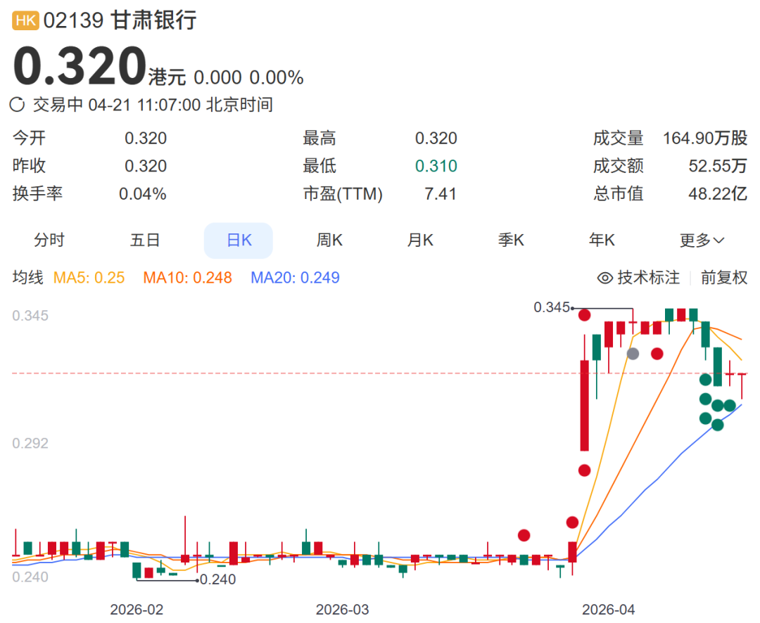 近半年,甘肃银行的股价徘徊在0.25港元/股左右,4月份上涨至0.32元左右,较发行价下跌约90%。
