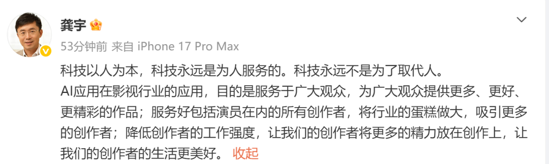 消息一出便引爆了社交媒体。不少网友对AI技术替代真人表演、冲击行业生态表示忧虑。