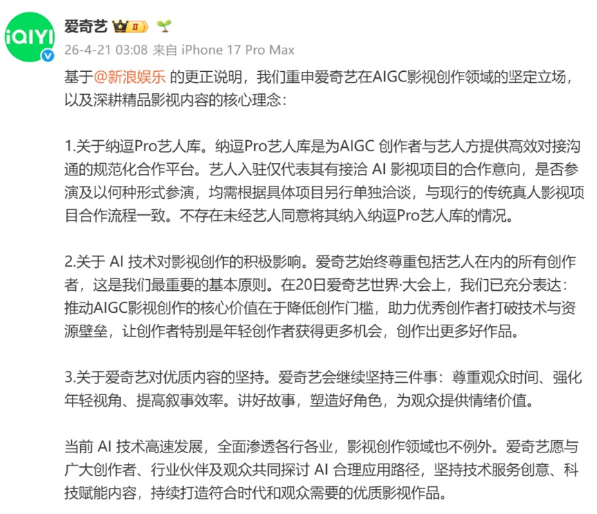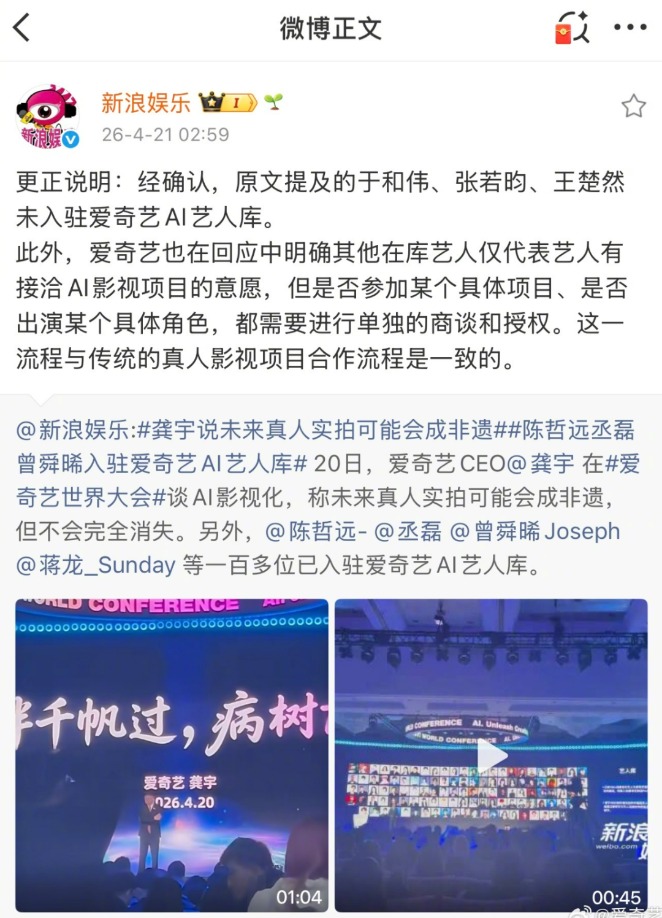 4月21日凌晨,新浪娱乐对上述微博内容进行引用,并更正表示:经确认,原文提及的于和伟、张若昀、王楚然未入驻爱奇艺AI艺人库。