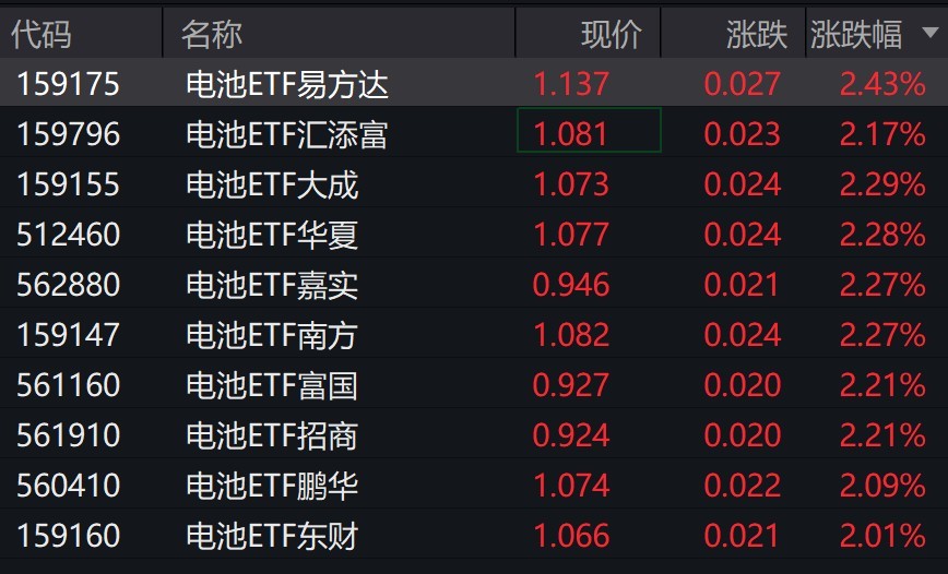电池概念股走强,天赐材料涨超6%,亿纬锂能涨超4%,宁德时代、先导智能涨超3%。