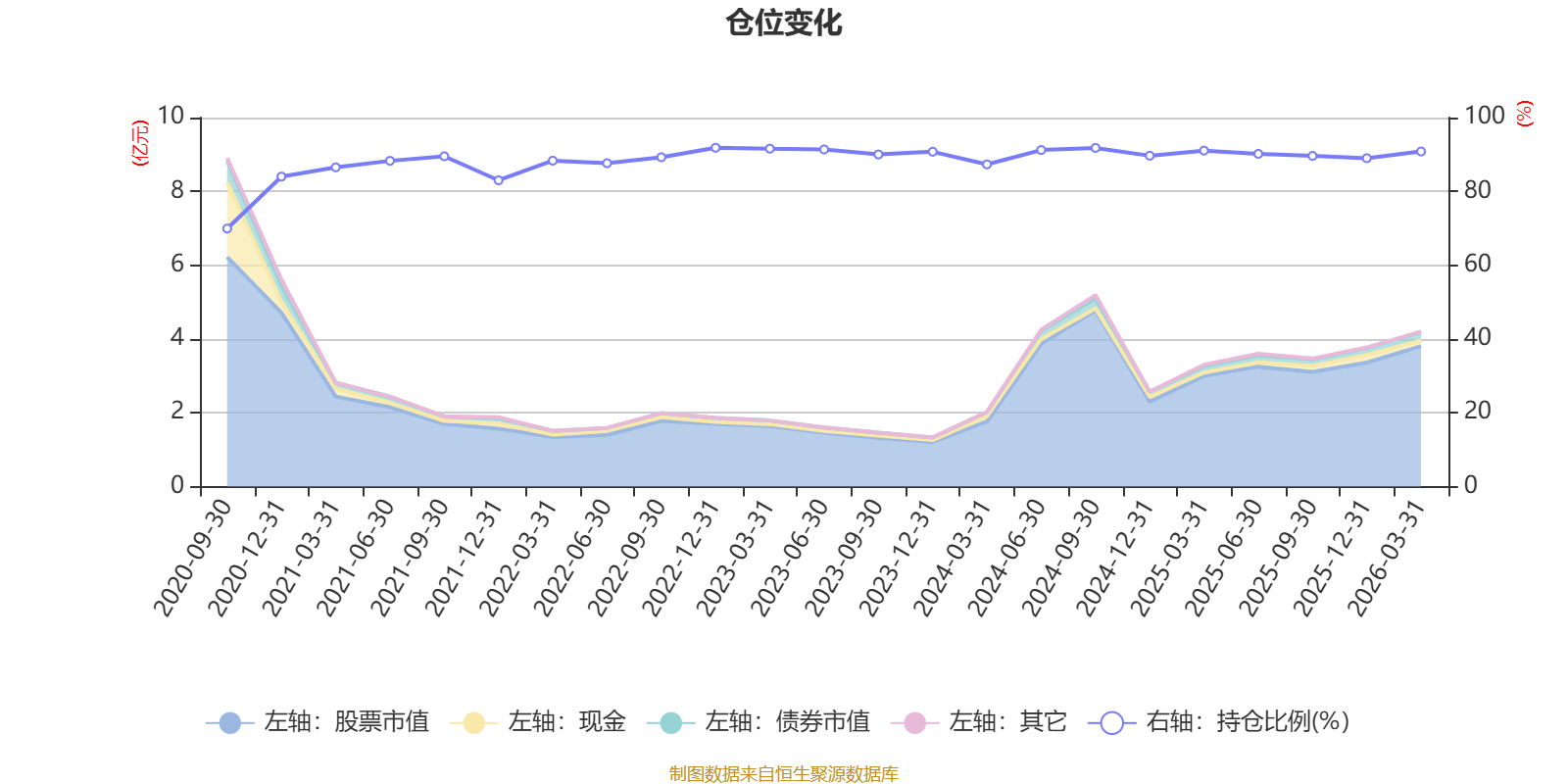 据定期报告数据统计,近三年平均股票仓位为90.23%,同类平均为85.8%。2022年末基金达到91.83%的最高仓位,2020年三季度末最低,为69.92%。