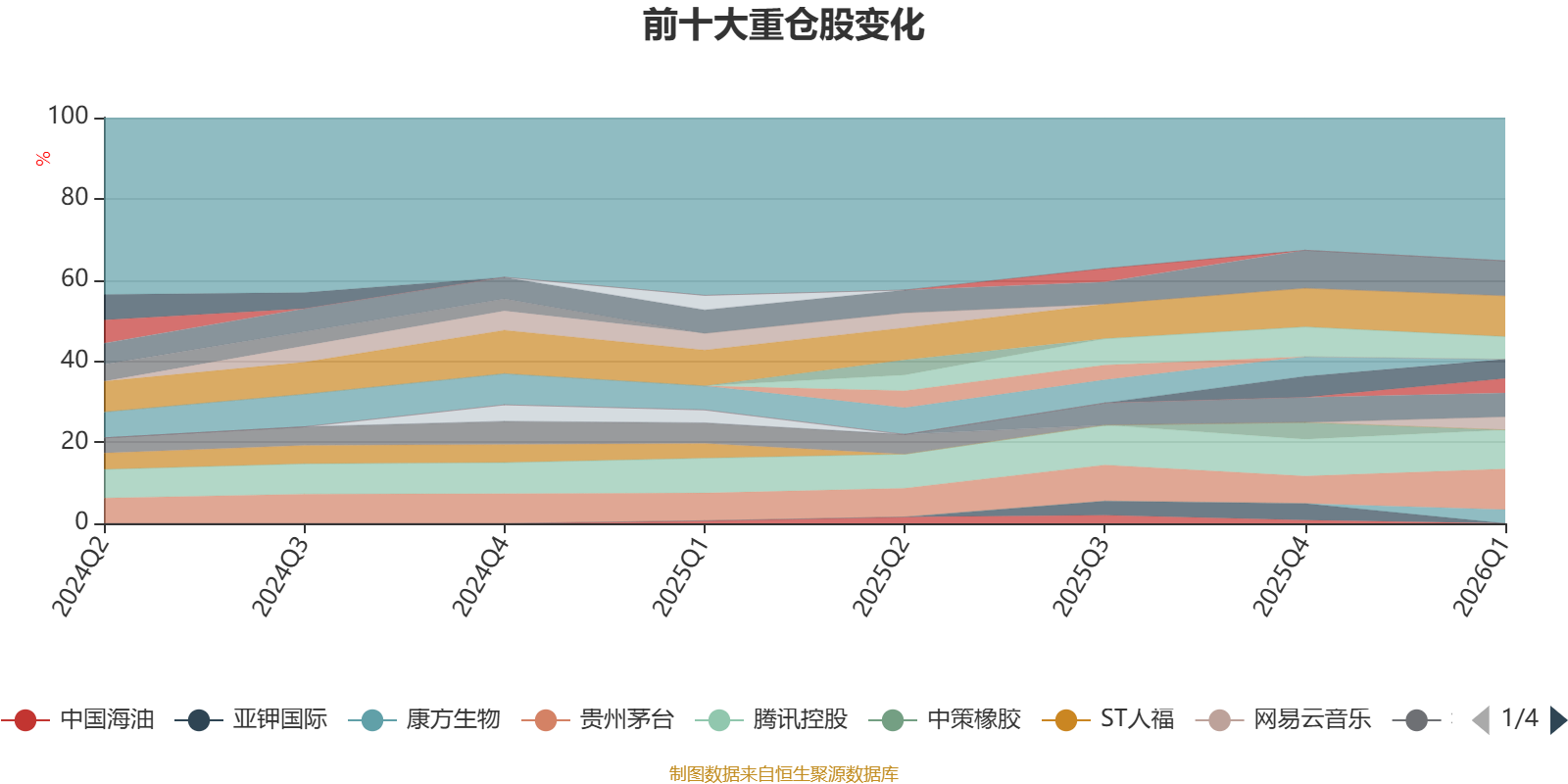 该基金持股集中度较高。截至2026年一季度末,基金十大重仓股分别是中国海洋石油、贵州茅台、腾讯控股、美的集团、美团-W、紫金矿业、巨星科技、药明康德、康方生物、网易云音乐。
