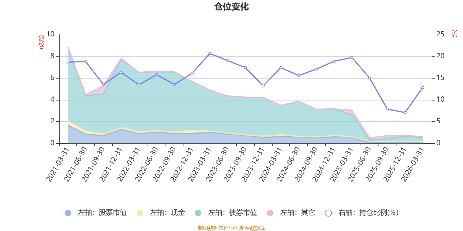 据定期报告数据统计,近三年平均股票仓位为15.1%,同类平均为19.03%。2023年一季度末基金达到20.67%的最高仓位,2025年末最低,为7.08%。