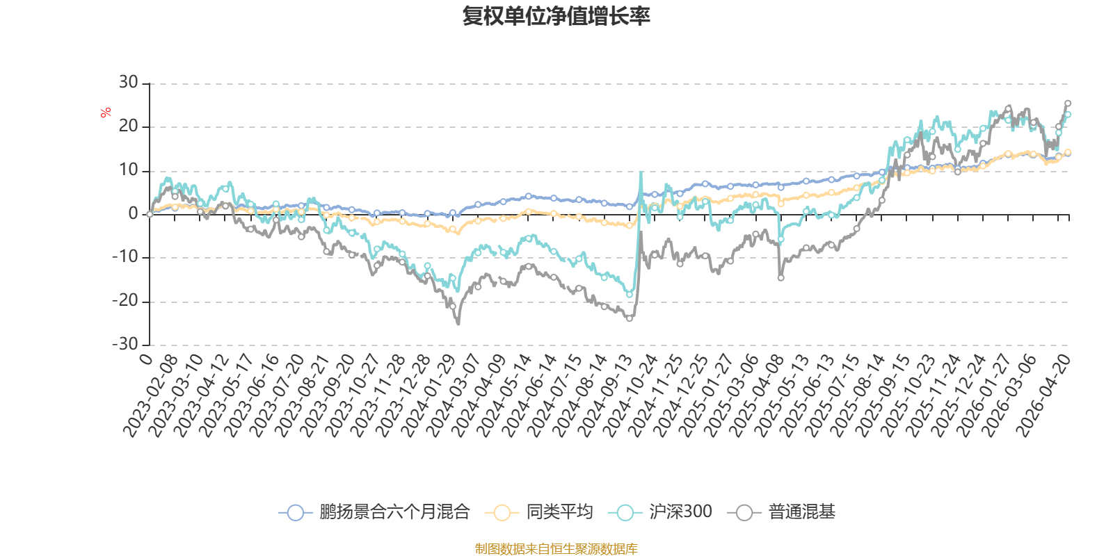 截至4月20日,鹏扬景合六个月混合近三个月复权单位净值增长率为0.60%,位于同类可比基金274/629;近半年复权单位净值增长率为3.30%,位于同类可比基金230/629;近一年复权单位净值增长率为6.61%,位于同类可比基金368/629;近三年复权单位净值增长率为11.75%,位于同类可比基金289/582。