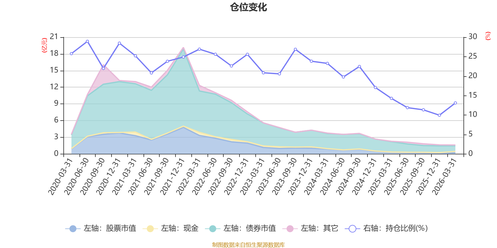 据定期报告数据统计,近三年平均股票仓位为17.87%,同类平均为19.03%。2020年上半年末基金达到28.94%的最高仓位,2025年末最低,为9.95%。