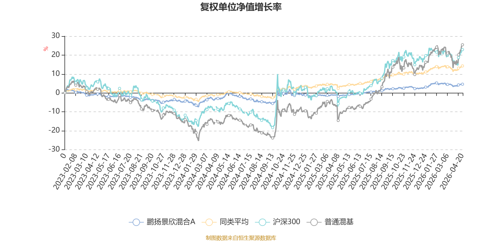 截至4月20日,鹏扬景欣混合A近三个月复权单位净值增长率为-0.23%,位于同类可比基金462/629;近半年复权单位净值增长率为2.31%,位于同类可比基金354/629;近一年复权单位净值增长率为6.00%,位于同类可比基金408/629;近三年复权单位净值增长率为5.53%,位于同类可比基金479/582。