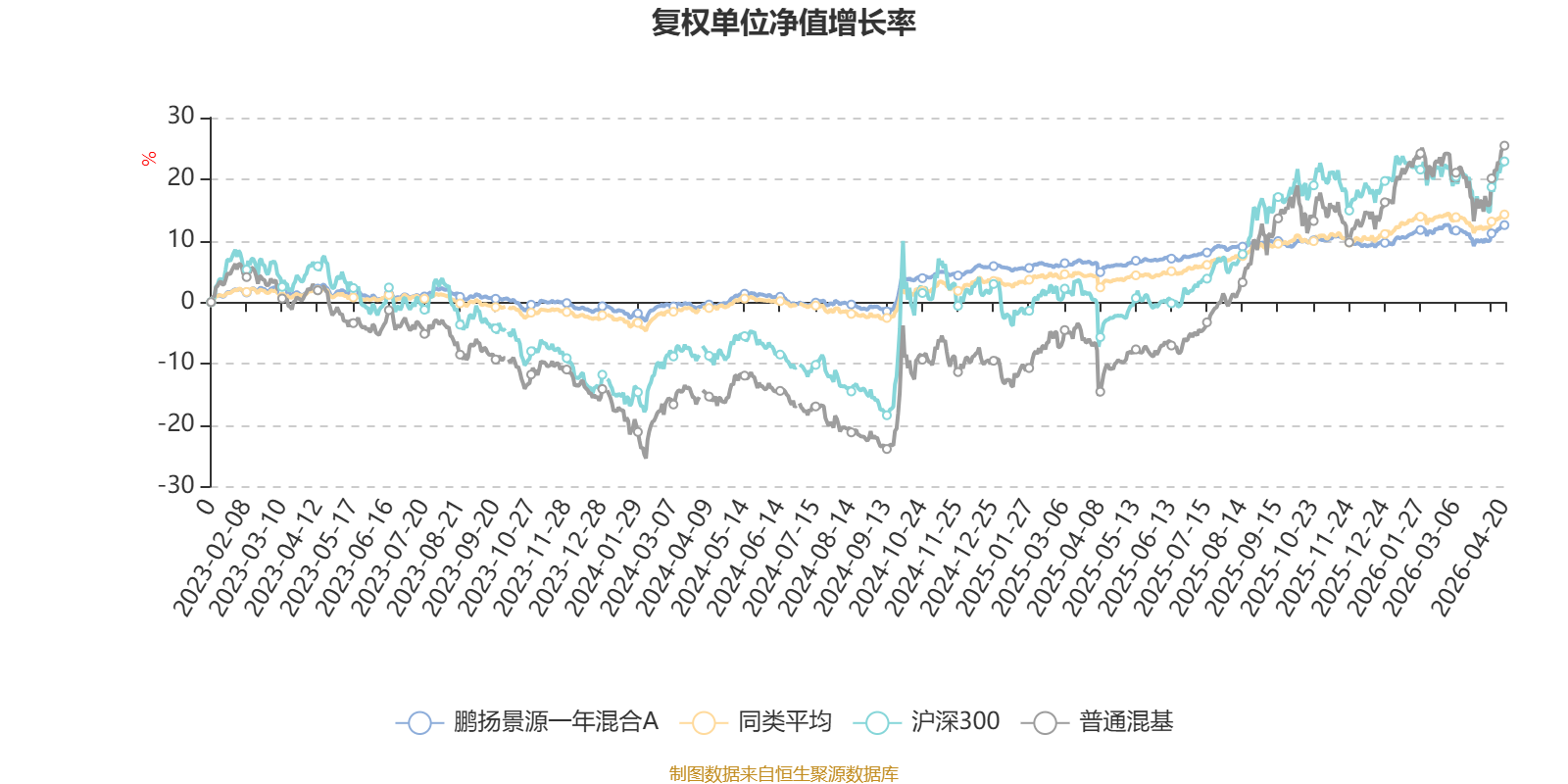 截至4月20日,鹏扬景源一年混合A近三个月复权单位净值增长率为1.27%,位于同类可比基金160/629;近半年复权单位净值增长率为2.52%,位于同类可比基金324/629;近一年复权单位净值增长率为6.30%,位于同类可比基金390/629;近三年复权单位净值增长率为10.08%,位于同类可比基金338/582。