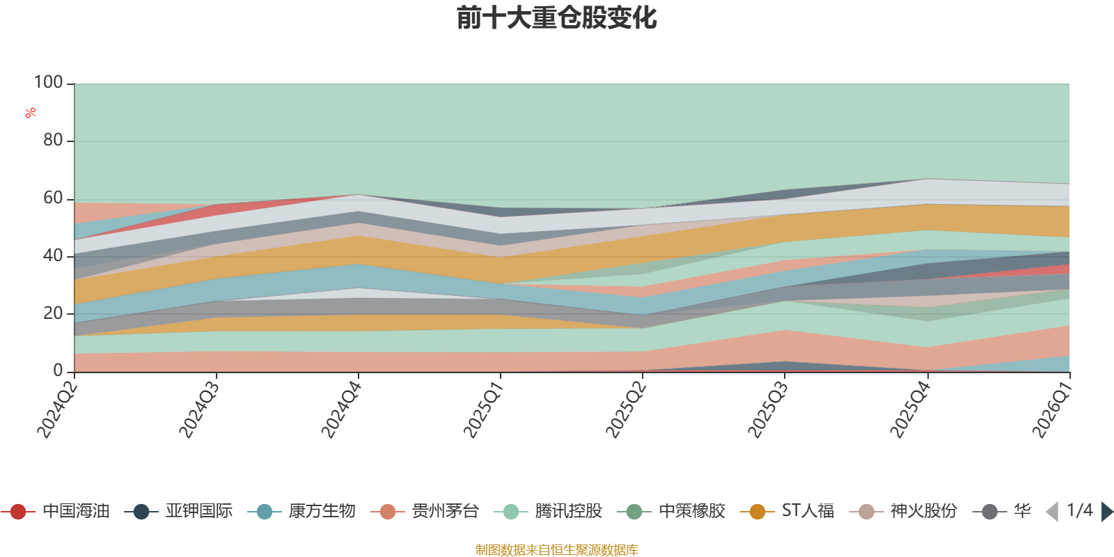 该基金持股集中度较高。截至2026年一季度末,基金十大重仓股分别是中国海洋石油、贵州茅台、腾讯控股、美的集团、康方生物、美团-W、紫金矿业、巨星科技、中策橡胶、药明康德。