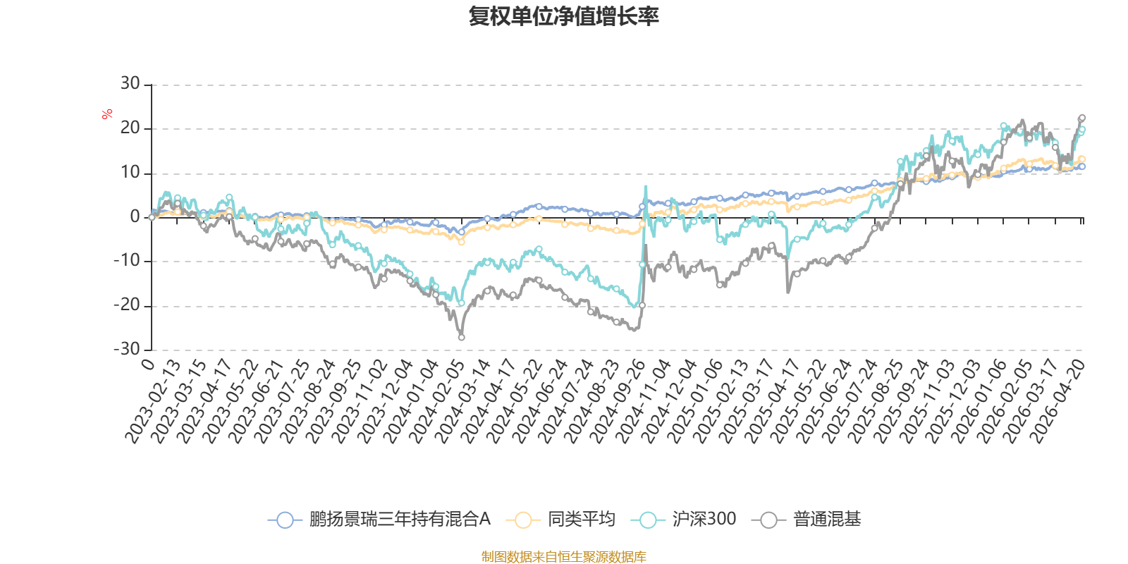 截至4月20日,鹏扬景瑞三年持有混合A近三个月复权单位净值增长率为1.00%,位于同类可比基金207/629;近半年复权单位净值增长率为3.02%,位于同类可比基金265/629;近一年复权单位净值增长率为6.42%,位于同类可比基金384/629;近三年复权单位净值增长率为10.41%,位于同类可比基金331/582。