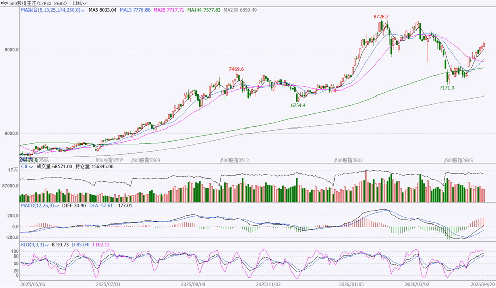 IC加权反弹幅度或受到制约,尤其是量仓等指标变化逐渐明显。周一早盘IC加权略低开后震荡上行,盘中维持强势,尾盘持稳,以小阳线报收。IC主连合约较现货指数大幅贴水,净基差波动略弱于正常水平,主连合约仓位增加较多,其他合约亦以增仓为主,成交量较前几个交易日缩减较多。IC加权MACD指标红柱仍在放大,KDJ快线在高位运行,日K线上行压力渐显,建议多单谨慎持有。