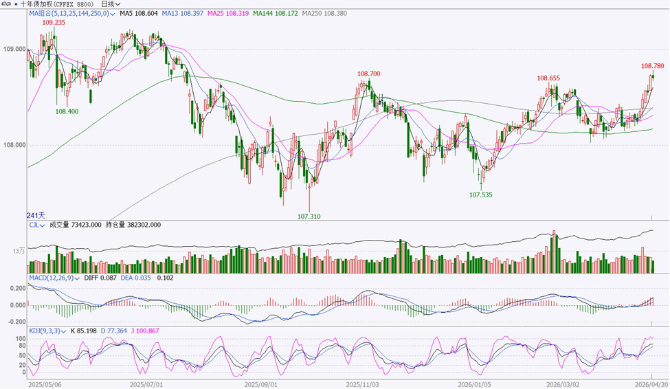 T加权连续上行,突破前期高点后有整固需求,量仓等指标波动将加大。周一早盘T加权高开后快速回落以阴星线报收。T主连合约减仓较多,其他合约仓位不同程度增加,总体仓位变化不大,成交量缩减较多。T加权MACD指标红柱仍在放大,KDJ快线在高位运行,日K线延续强势需量能配合。短期市场走势偏强,建议多单持有。