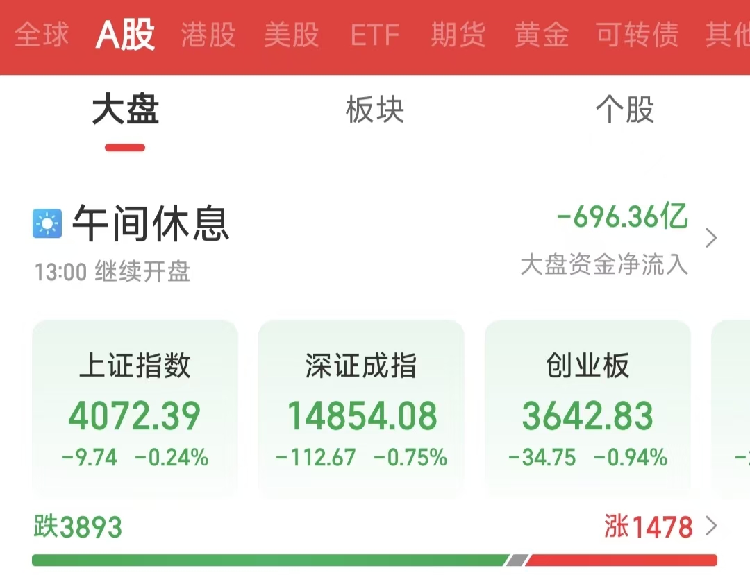 周二(4月21日)早盘上证指数呈现窄幅震荡格局。截至上午收盘,上证指数下跌0.24%,报4072.39点;深证成指下跌0.75%,报14854.08点;创业板指下跌0.94%,报3642.83点。沪深两市合计成交额约1.57万亿元。总体来看,个股跌多涨少,共有1478只个股实现上涨。