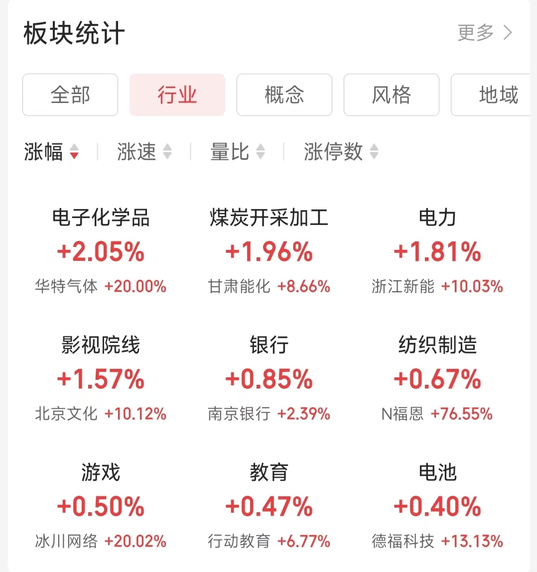 行业热点方面,数据显示,截至4月21日上午收盘,在A股二级行业中,电子化学品行业涨幅达到2.05%,位居榜首。煤炭开采加工(涨幅1.96%)、电力(涨幅1.81%)、影视院线(涨幅1.57%)等行业紧随其后。此外,银行、纺织制造、游戏、教育、电池等行业也表现活跃,涨幅均超过0.4%。