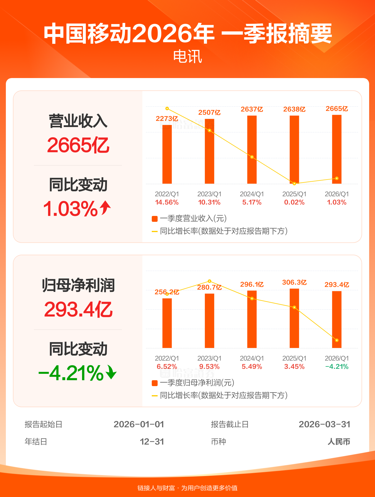 中国移动4月20日发布一季报业绩,截至2026年3月31日的3个月内,该公司营业收入2664.78亿人民币,同比增长1.03%;公司权益持有人应占溢利(归母净利润)293.42亿人民币,同比减少4.21%。