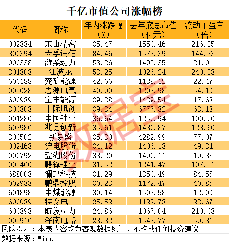 按照盘中最高价与该股去年底收盘价相比,东山精密股价涨幅已超100%。自此,东山精密也成为今年来第一只股价翻倍的千亿市值公司。截至去年底,东山精密总市值为1550.46亿元,最新总市值超3100亿元。