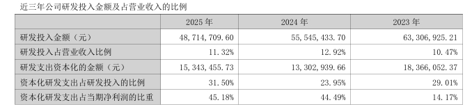 不过,从报告透露的研发投入看,最近三年数据显示,公司的研发投入金额连续下滑,2023年为6330.69万元,2024年降至5554.54万元,2025年降至4871.47万元。