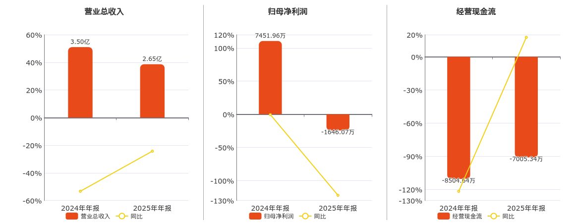 公司营业总收入为2.65亿元,较去年同报告期营业总收入减少8498.31万元,同比较去年同期下降24.28%。归母净利润为-1646.07万元,较去年同报告期归母净利润减少9098.03万元,同比较去年同期下降122.09%。经营活动现金净流入为-7005.34万元。