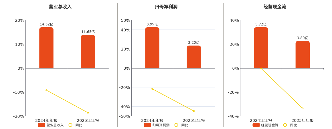 公司营业总收入为11.65亿元,较去年同报告期营业总收入减少2.67亿元,同比较去年同期下降18.64%。归母净利润为2.20亿元,较去年同报告期归母净利润减少1.79亿元,同比较去年同期下降44.84%。经营活动现金净流入为3.80亿元,较去年同报告期经营活动现金净流入减少1.93亿元,同比较去年同期下降33.65%。