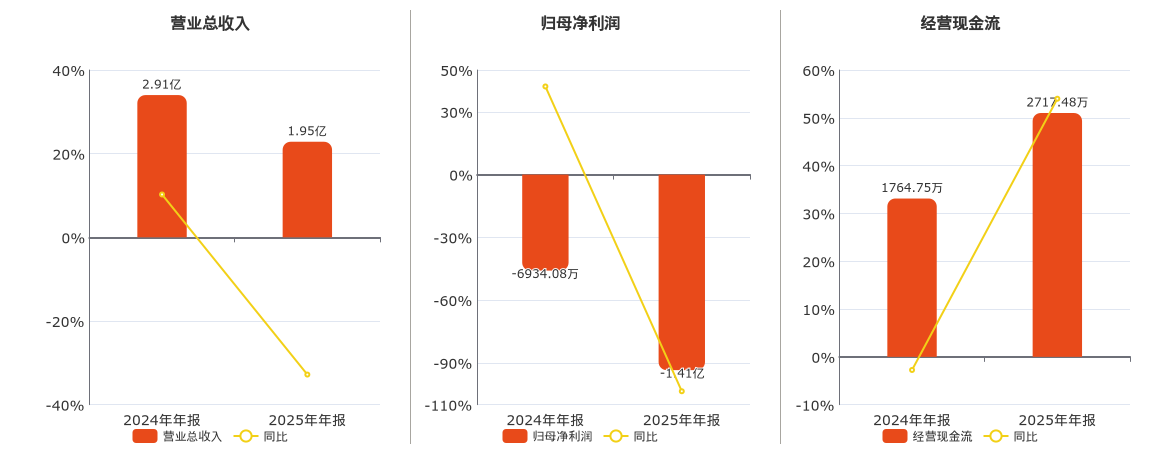 公司营业总收入为1.95亿元,较去年同报告期营业总收入减少9531.59万元,同比较去年同期下降32.81%。归母净利润为-1.41亿元,较去年同报告期归母净利润减少7184.02万元。经营活动现金净流入为2717.48万元。